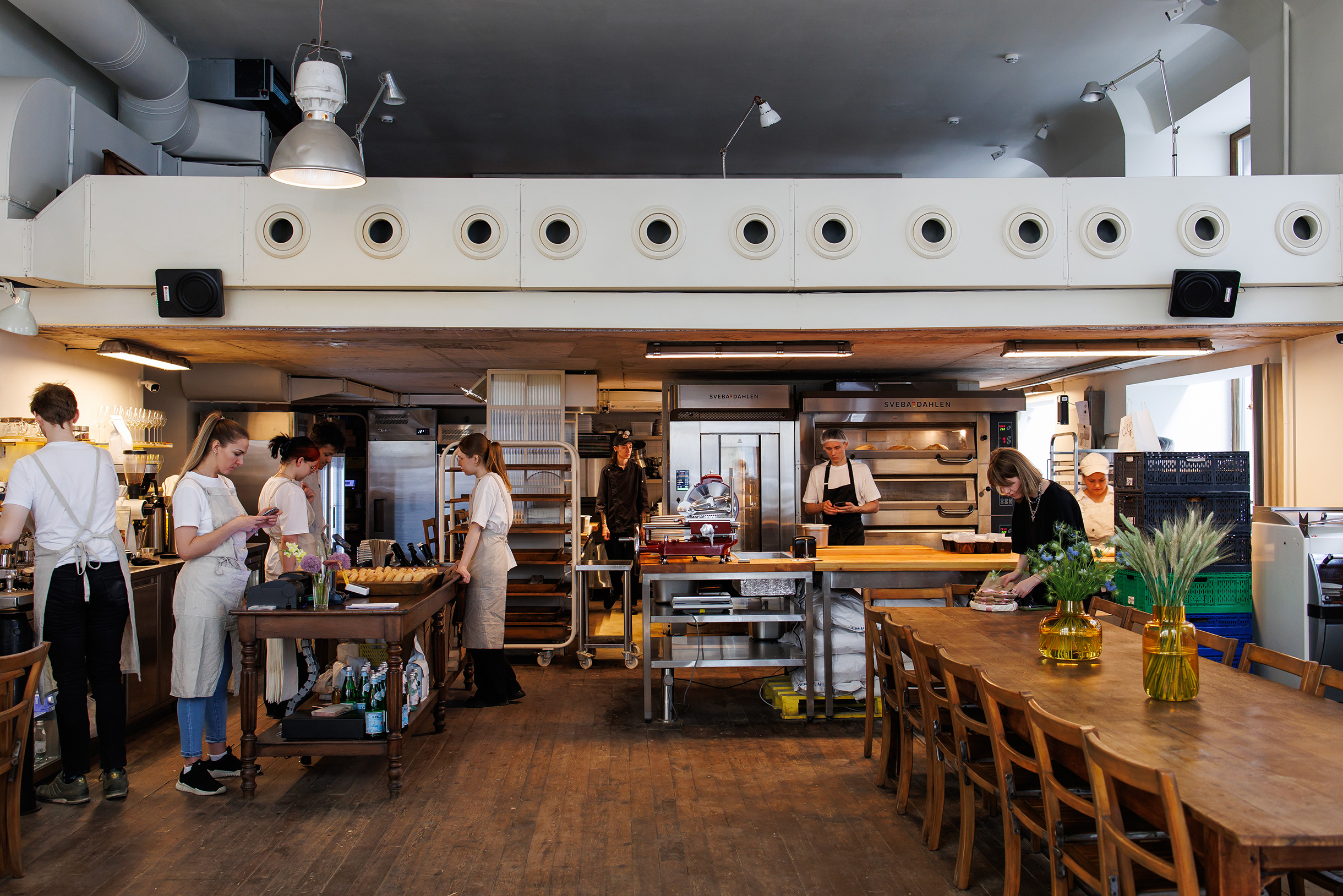 Открытый цех, где за чашкой кофе или бокалом вина можно наблюдать за всеми этапами – от замеса до отпёка хлеба долгой ферментации.
